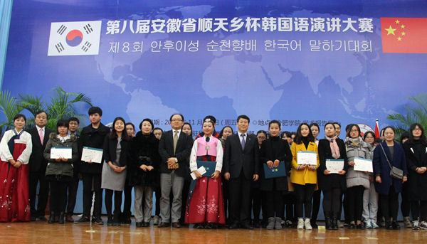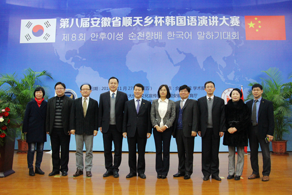韩国驻上海总领事馆教育领事李善雨、顺天乡大学副校长金洪镇、顺天乡大学汉语教育院院长朴炯春、李大基,我校客座教授赵诚惠等应邀担任比赛评委。合肥市副市长吴春梅、安徽省教育厅外事处孔德俊等出席开幕式,校党委书记蔡敬民主持开幕式。来自安徽省14所高校的29名选手参加比赛。