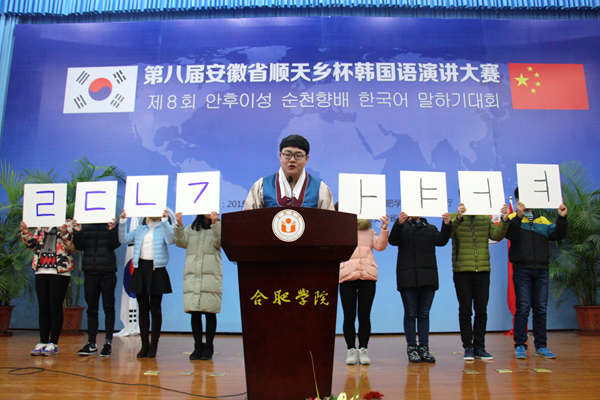11月27日,第八届安徽省顺天乡杯韩国语演讲比赛在合肥学院图书馆学术报告厅举办。本次大赛由韩国驻华大使馆文化宣传部、安徽省教育厅主办,韩国顺天乡大学、合肥学院承办,中国—合肥韩国中心、韩大文化交流有限公司协办。