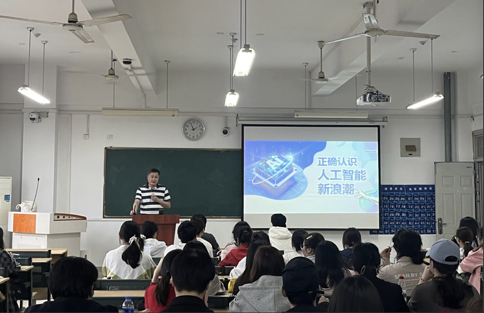 5月8日下午,副校长王晓峰为23级汉语言文学专业学生讲授“正确认识人工智能新浪潮”。他从认清发展态势、应用走深走实、筑牢发展优势三方面,帮助学生了解人工智能趋势,增强科技自立自强信心。他鼓励学生培养数字技能,在坚守人文精神的同时提升竞争力,以前沿案例引发学生思想共鸣。
