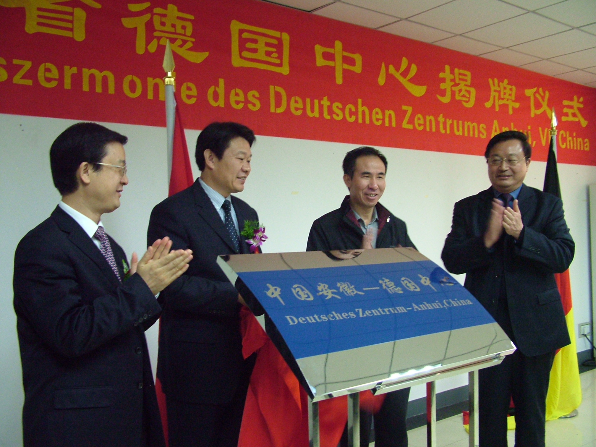 12月18日,“中国安徽―德国中心”在合肥学院成立,省外事办公室主任李永胜(左二),省教育厅厅长程艺(左三),合肥市委常委、常务副市长张晓嶙(左一),合肥学院党委书记陶登松为中心揭牌。