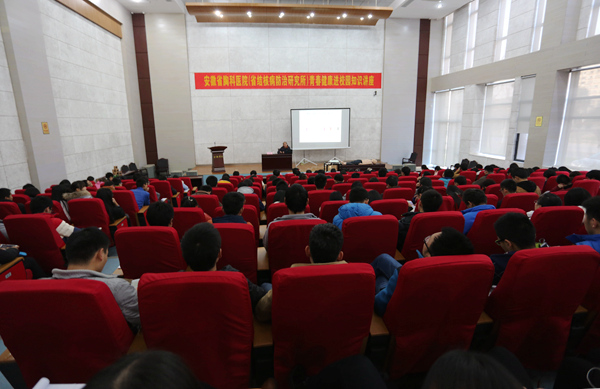 安徽省胸科医院、省结核病防治研究所党委委员、副所长邹铮,安徽省胸科医院、省结核病防治研究所结核主任医师李东方,省结核病防治研究所急诊医学科副主任医师王卫阳分别从艾滋病、结核病和雾霾三个方面简要介绍了其起因、发展及预防措施。讲师生动认真讲解,场下座无虚席,各系学生认真聆听记录。随后,周富如提出“体力是基础,智力是关键,毅力是保证,能力是体现”的20字箴言,告诫同学们身体才是革命的本钱。王卫阳向在场同学展示了生活急救示范,并鼓励同学们积极上台参与示范,同学们个个跃跃欲试,现场气氛热烈。